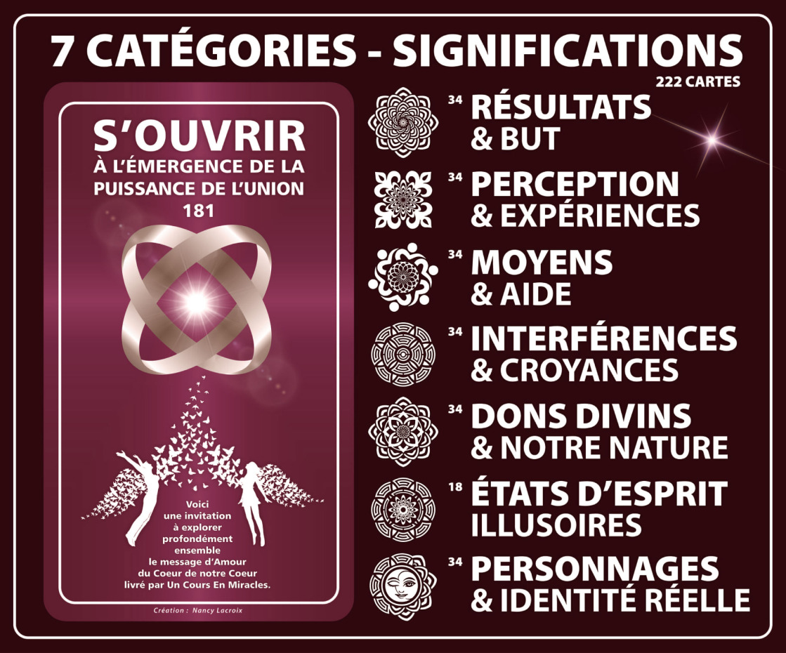 La majorité des cartes m'ont été inspirées par des guidances qui me sont arrivées en temps réel sur un thème particulier (en pigeant au "hasard" dans le livre); parce que lorsqu'on entre relation avec le message du Cours en Miracles, c'est miraculeux !